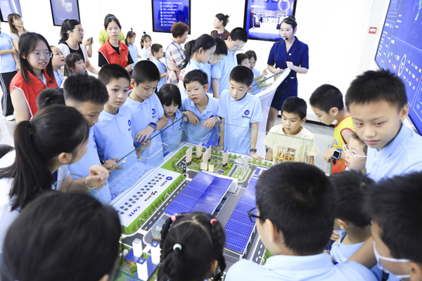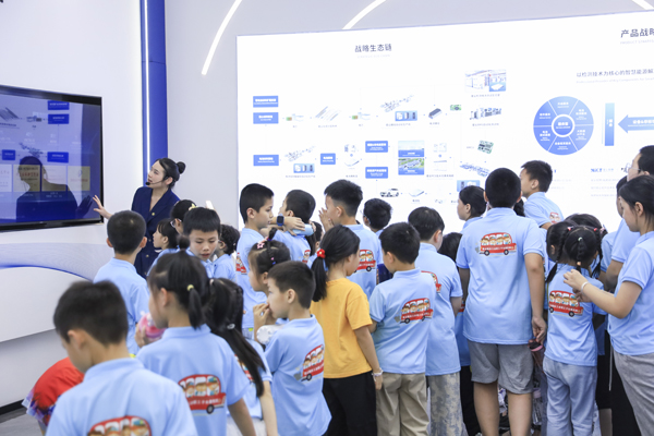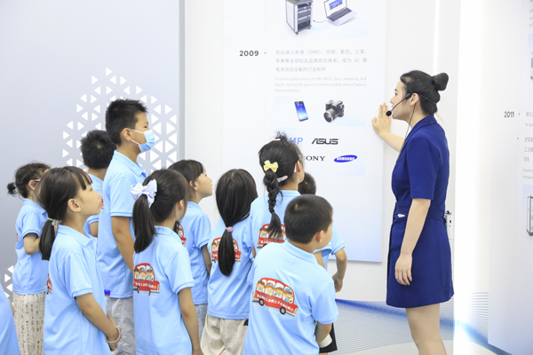 讲解员和志愿者带领孩子们参观企业展厅