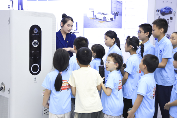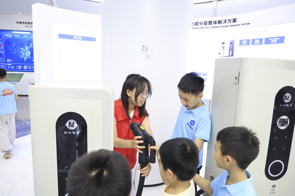 宣传片观看结束后,孩子们最期待的展厅探秘环节正式开始。在讲解员和志愿者的带领下,孩子们步入了展厅,沉浸式感受科技的魅力。讲解员用生动易懂的语言,结合香港大学志愿者们的实物操作演示,将复杂的锂电池检测技术、新能源汽车充电技术讲述得妙趣横生、直白易懂。孩子们兴致勃勃,认真聆听讲解。